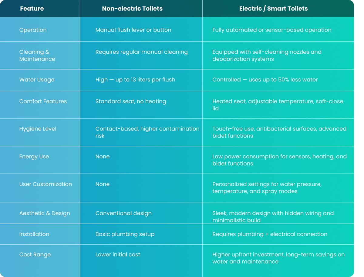 Smart toilets consume very little power. Most features—such as heated seats, sensors, and LED lights—operate on low wattage. On average, a smart electric toilet uses less electricity than a standard light bulb. With power-efficient components and standby mode, BioGiene smart toilets are designed to deliver premium comfort without significantly increasing your electricity bill.